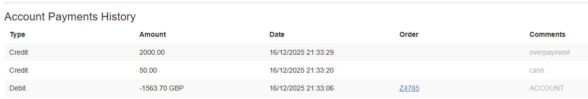 Use the controls here to add an Account Payment. The User can also add a comment regarding that payment, which will be logged.
