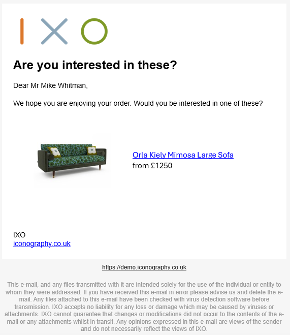 28 days after a customer has placed an order, they will be sent a recommendation for other popular Products.