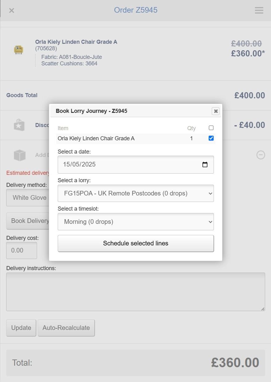 4. Clicking "Book Delivery" will open up a scheduler popup. In here you can select the appropriate products that you wish to book the delivery for, as well as the date, lorry and timeslot.