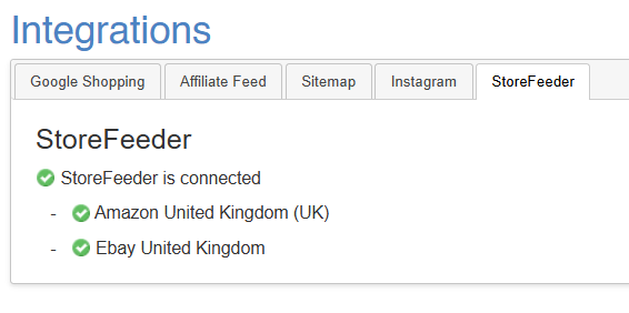 The current status of the StoreFeeder link is visible within the Integrations section.