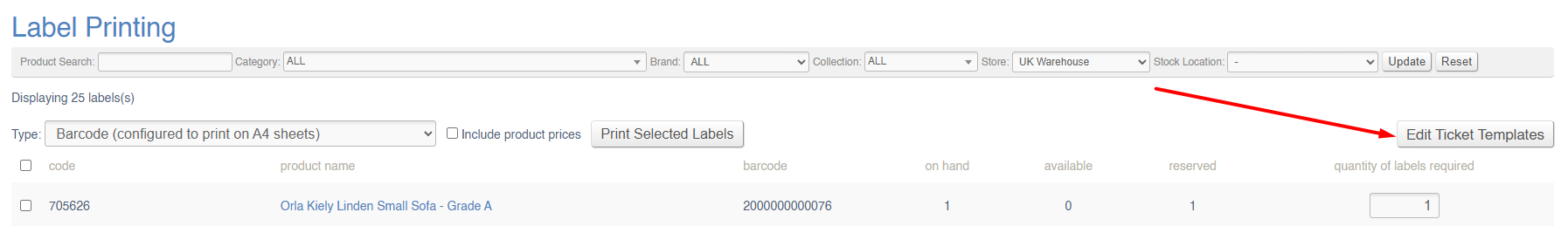 Tickets are a type of Label, and can be printed from the Label Printing screen.