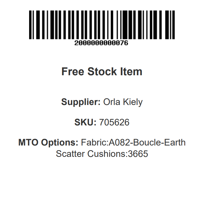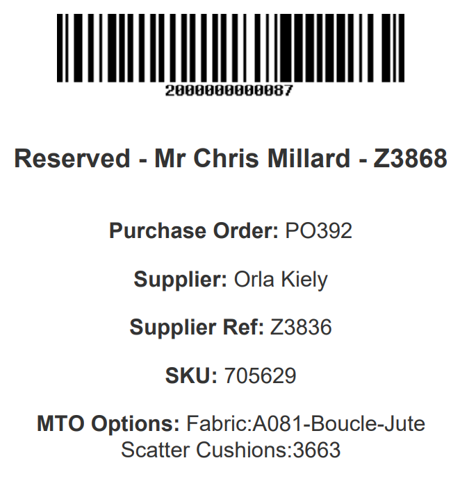 These are larger labels, which will have more detailed information on the unit of stock. These typically include SKU code, details of any Customisations, as well as the Supplier and barcode.