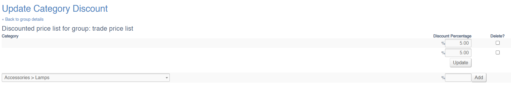 To build a Category specific Price List, simply select a Category from the Drop Down List, and add a percentage discount.