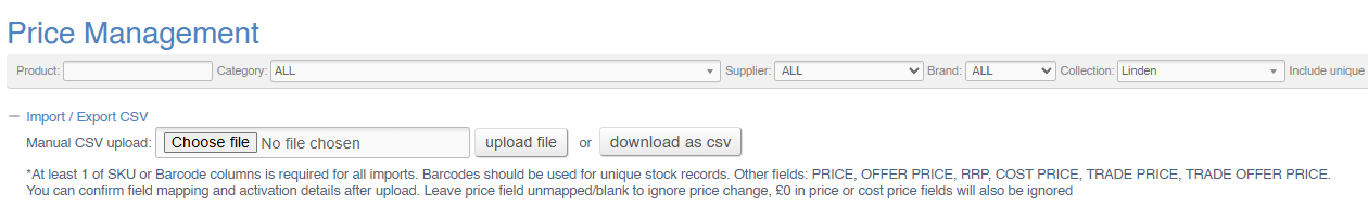 To export prices via a CSV, use the search and filters to locate the Products and Unique Stock Records that you need to edit. You can then export