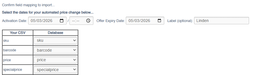 To import a file simply use the controls and map your data appropriately. You will also need to enter an activation date for your price changes.