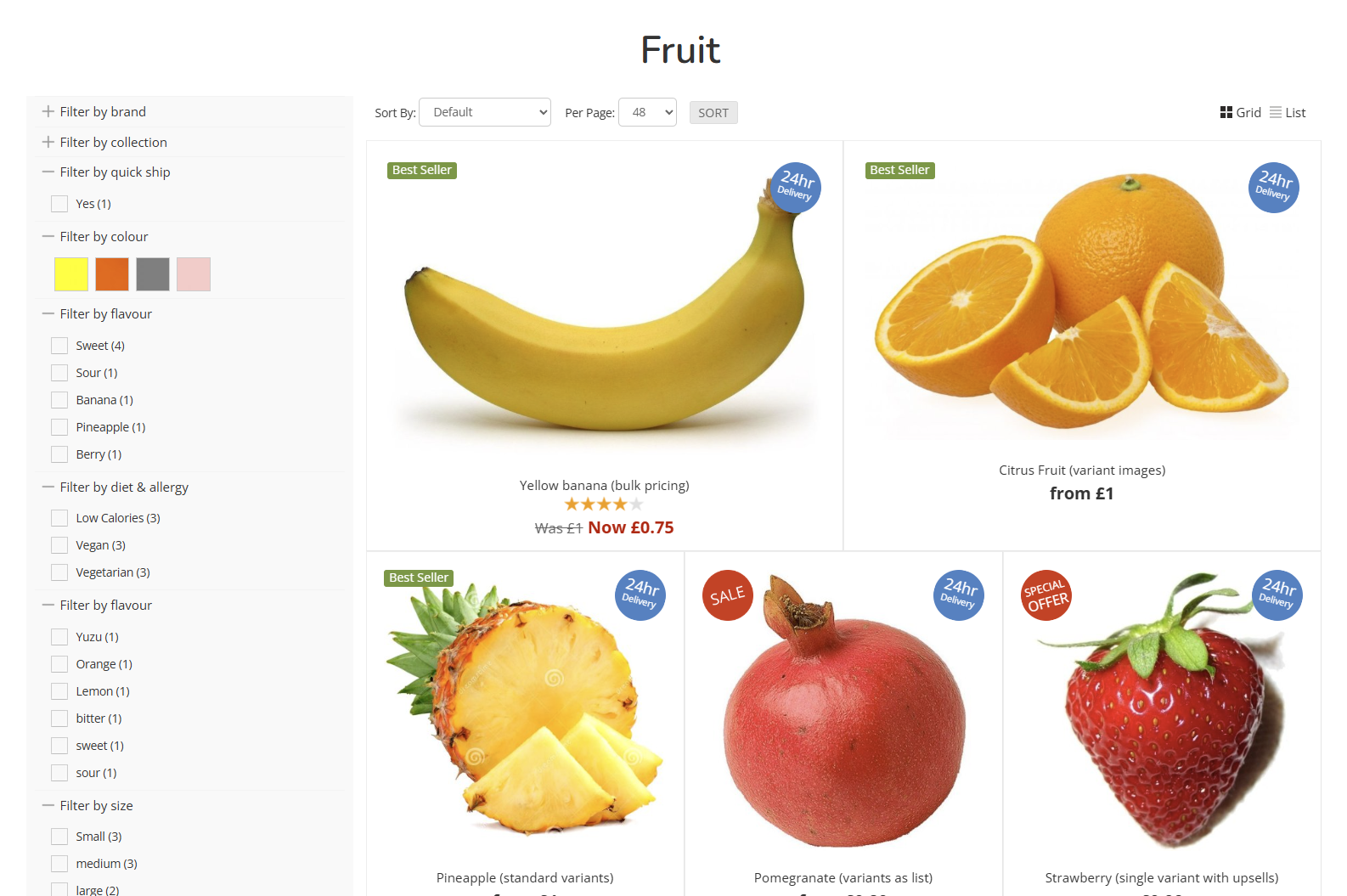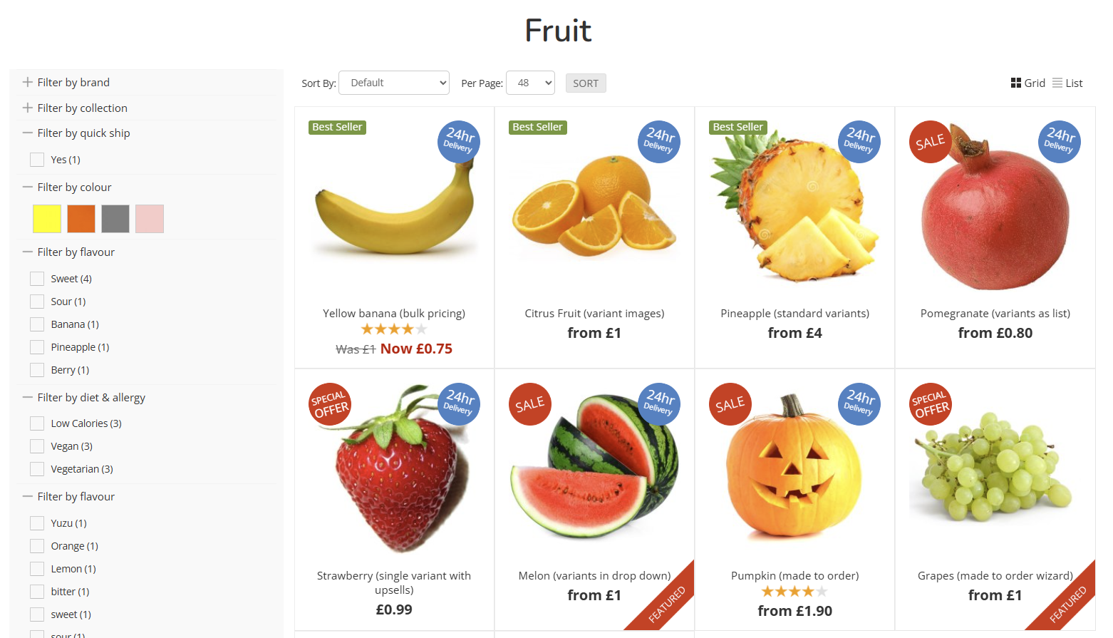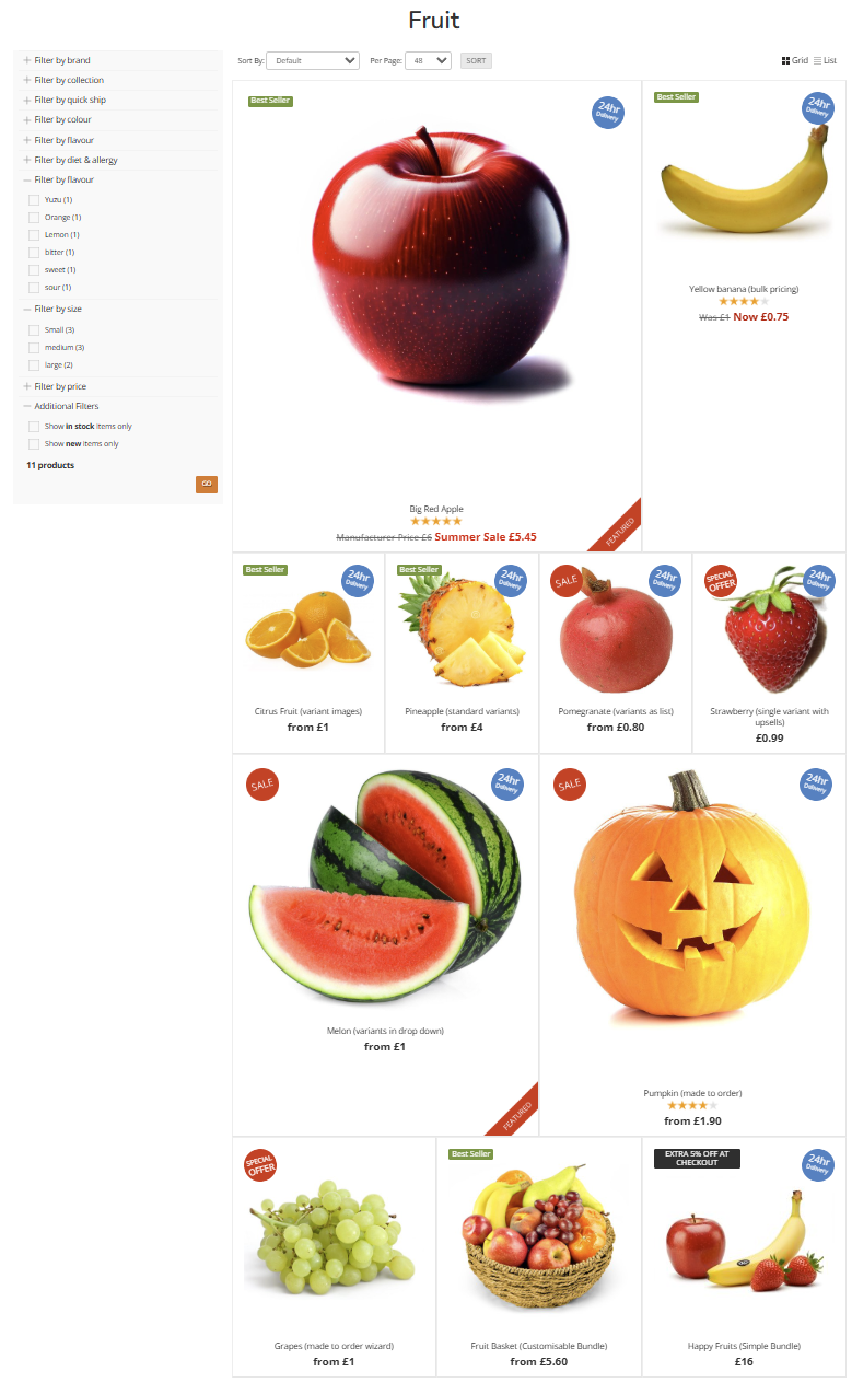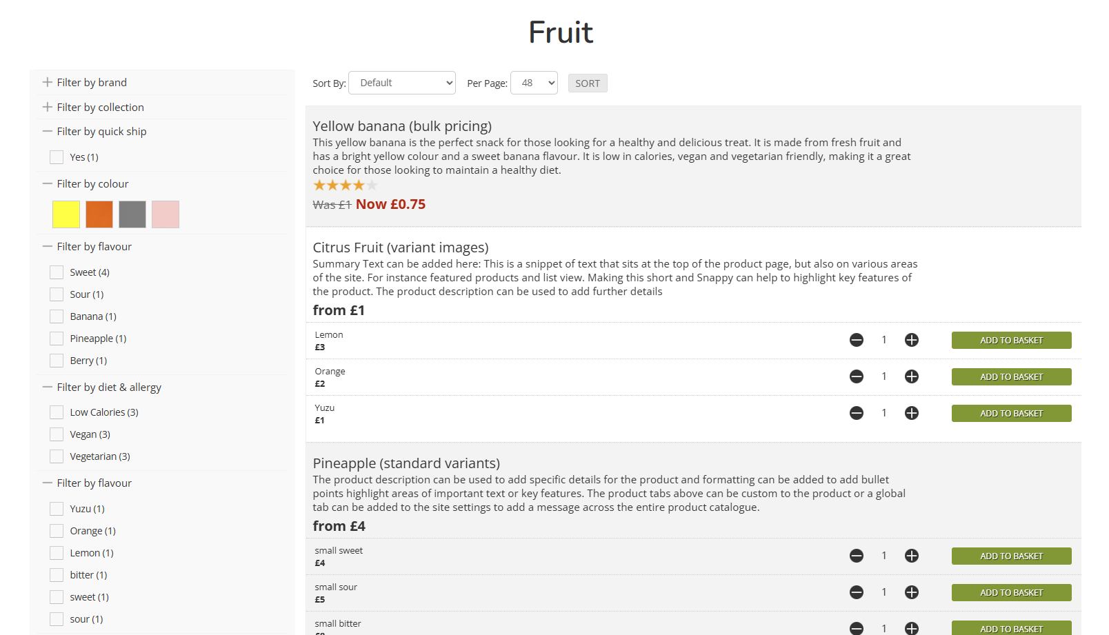 This is ideal for Products for simple options, e.g. sizing, or where you expect a Customer to purchase multiple items from the same Product Listing Page