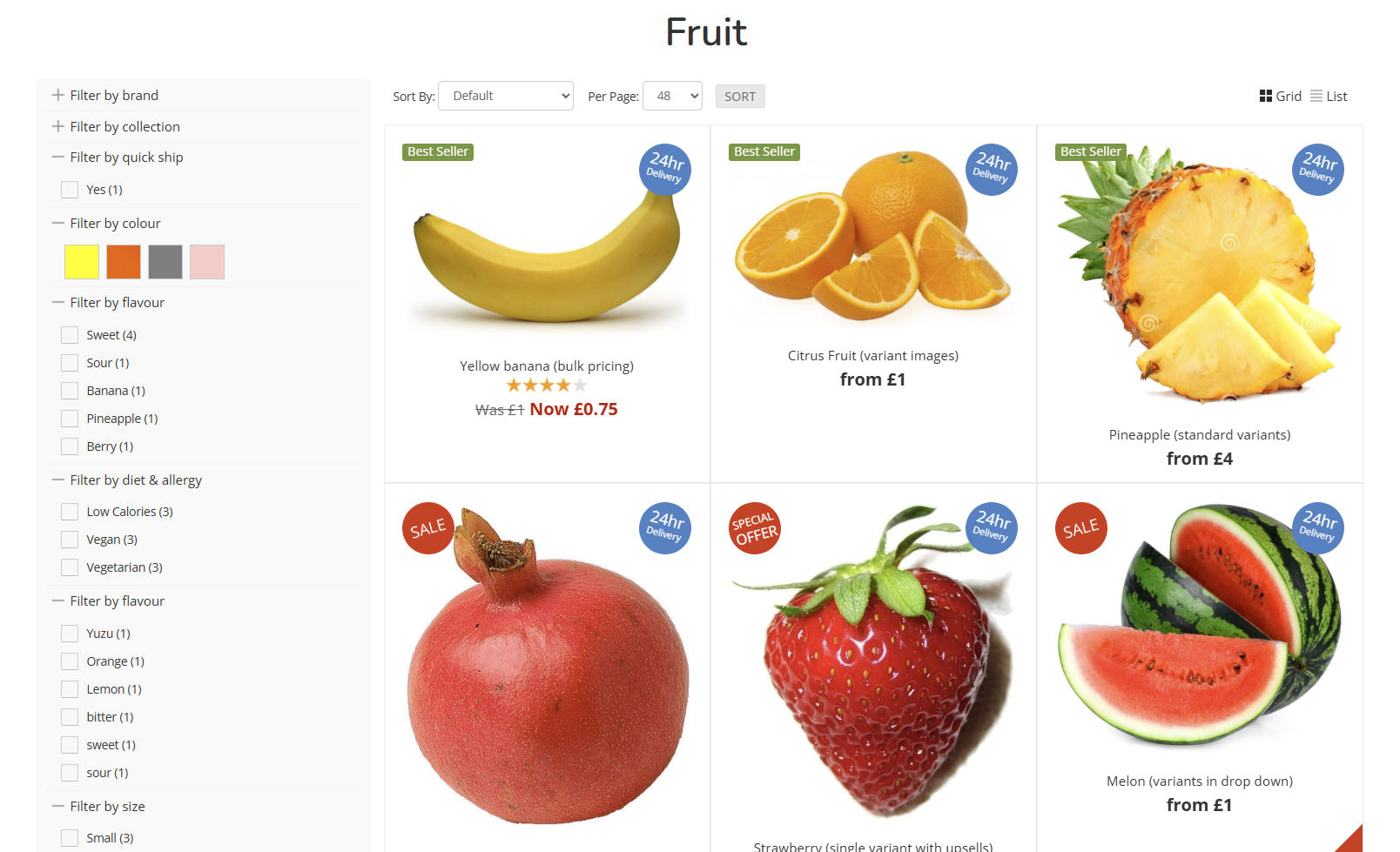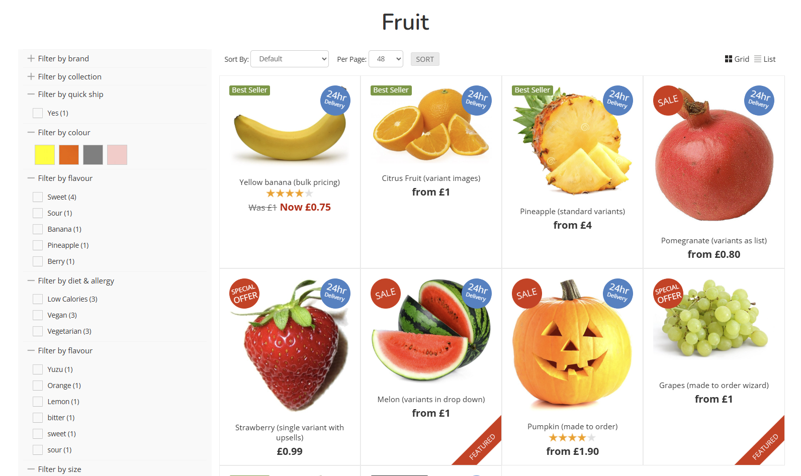 This is ideal for Products for simple options, e.g. sizing, or where you expect a Customer to purchase multiple items from the same Product Listing Page