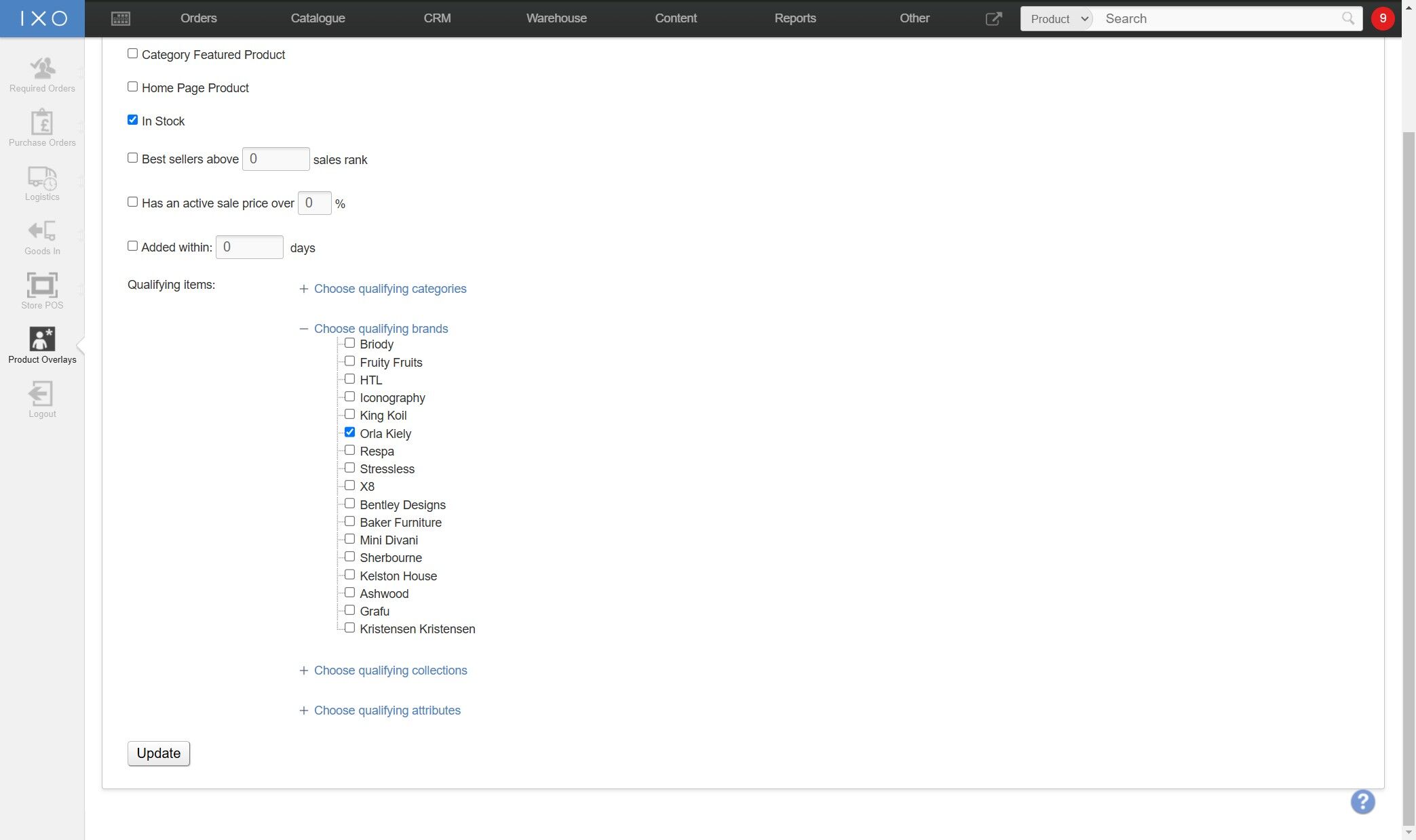 6. You may wish to assign the Overlay to specific categories, brands and/or collections. You can also assign to specific attributes that are assigned to products (colour, size etc).