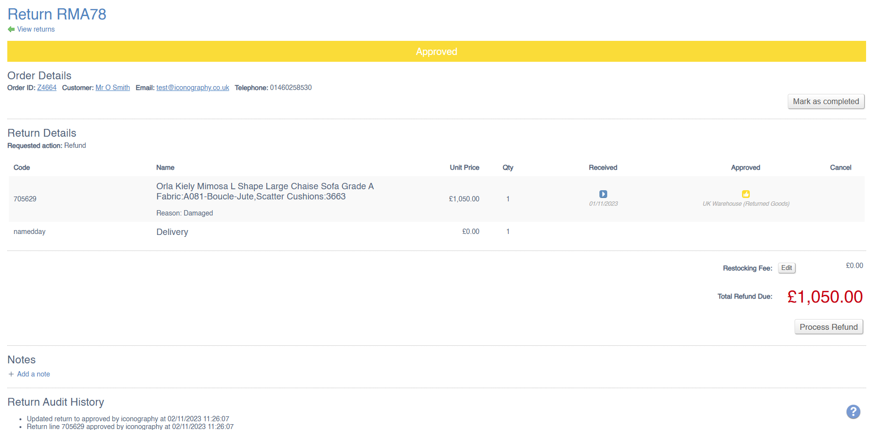 Use the tick boxes to process the RMA line item (it is possible to have multiple items on a single RMA)
