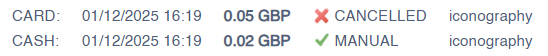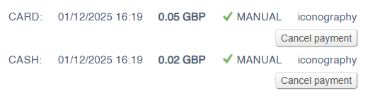 In order to cancel a payment, the user must have superuser access rights, and the payment must either be a 'Manual' or 'Cash' payment. To cancel the payment, simply press the relevant button: