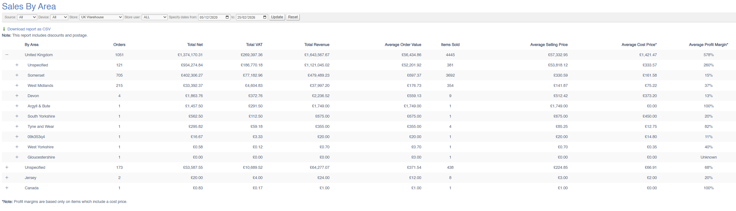 This report will show a breakdown of company-wide sales within a given period; the value of sales will be split by billing address.