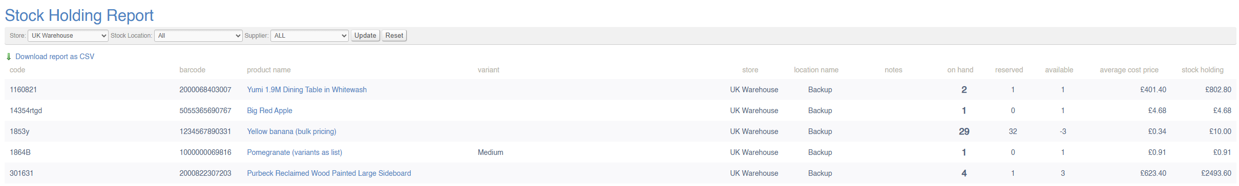 This gives a breakdown by Variant, and will not detail the Unique Stock Items, e.g. you have five Example Sofas in the same location; the report will not detail that one is red, one is blue and three are green.
