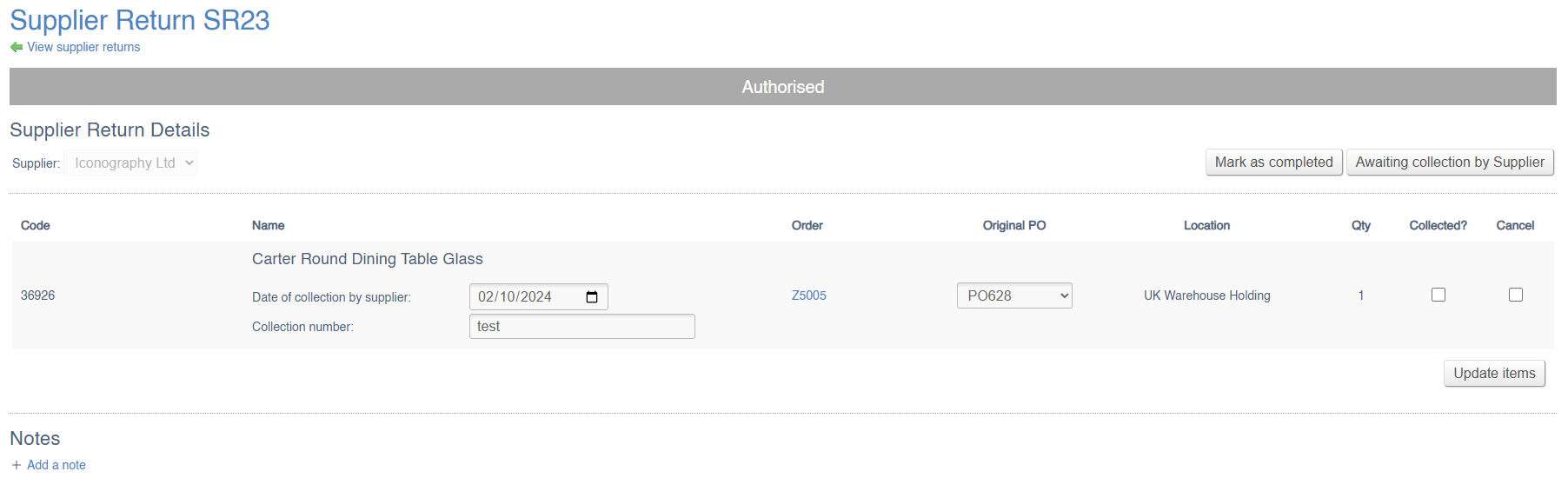 Use the tick boxes to process the Supplier Return line item (it is possible to have multiple items on a single Supplier Return)