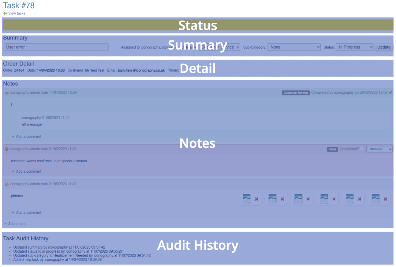 The Task page displays all of the relevant information about any specific Task, and allows the User to update and manage the Task as appropriate.